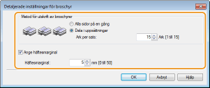 Om du använder en häftapparat eller ett annat bindningsverktyg anger du marginalbredden för broschyrens bindning. Markera kryssrutan [Ange häftesmarginal] och ange marginalbredden i [Häftesmarginal].