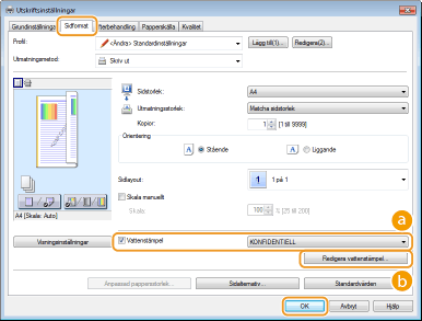 Du kan skriva ut vattenstämplar, till exempel "KOPIA" eller "KONFIDENTIELL", över dokumentet. Du kan skapa nya eller använda förregistrerade vattenstämplar.