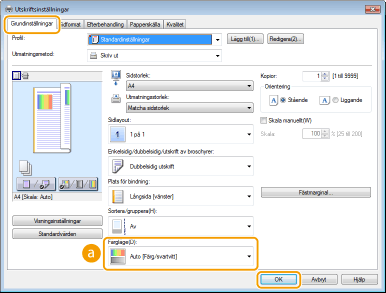 Du kan ange färgläge (färg eller svartvitt). Om ett dokument har sidor i både färg och svartvitt och om du anger läget Auto, skrivs färgsidor automatiskt ut i färg och svartvita sidor i svartvitt.