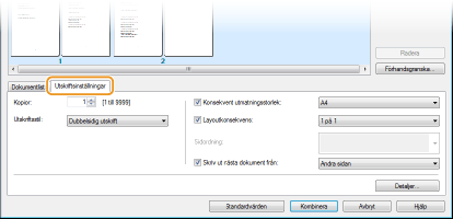 Klicka på fliken [Utskriftsinställningar] för att visa den skärm där du anger utskriftsinställningar, till exempel antal kopior och enkelsidig/dubbelsidig utskrift. Inställningar som görs här används på hela utskriftsjobbet.