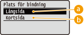 Ange om bindning ska göras, med ett bindningsverktyg som t.ex. en häftapparat, längs långsidan eller kortsidan vid dubbelsidig utskrift . Använd