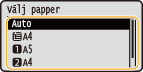 för att välja papperskälla och tryck sedan på