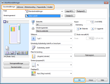 Klicka på fliken [Grundinställningar], [Sidformat], [Efterbehandling], [Papperskälla] eller [Kvalitet] för att ange utskriftsinställningar på de olika skärmarna efter behov. Olika utskriftsinställningar