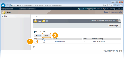 Markera kryssrutan vid dokumentet som ska tas bort och klicka på [Ta bort].