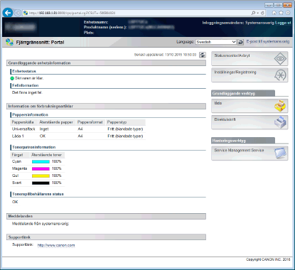 Du kan använda alla funktioner och inställningar i fjärranvändargränssnittet. Ange lösenordet för systemansvarig i [Lösenord].