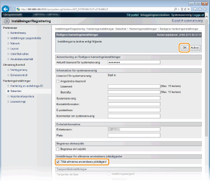 Du kan ange inställningar så att användare kan radera eller avbryta utskrifter av dokument även i läget för allmänna användare i fjärranvändargränssnittet.