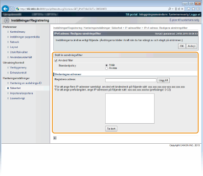Om IP-adresserna inte är rätt angivna kan det bli problem med att få åtkomst till enheten från fjärranvändargränssnittet. I så fall behöver du ange <Adressfilter> till <Av>. Adressfilter