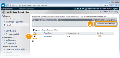 Om TLS redan är aktiverat genom [Inställningar för fjärranvändargränssnitt] eller [Inställningar för IPP-utskrift] visas inte [Standardnyckelinställningar]. Se steg 6 om du vill byta nyckel och avmarkera kryssrutorna [Använd TLS] under [Inställningar för fjärranvändargränssnitt] respektive [Inställningar för IPP-utskrift].