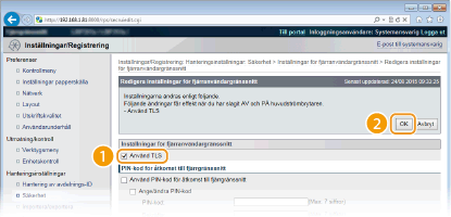 [Använd TLS] Markera kryssrutan när du vill använda TLS för kommunikation med fjärranvändargränsnittet. Avmarkera kryssrutan när det inte används.