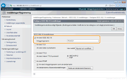 Använda kontrollpanelenDu kan även aktivera eller inaktivera IEEE 802.1X-autentisering på kontrollpanelens inställningsmeny. IEEE802.1X