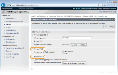 Markera kryssrutan [Använd TTLS] eller [Använd PEAP].