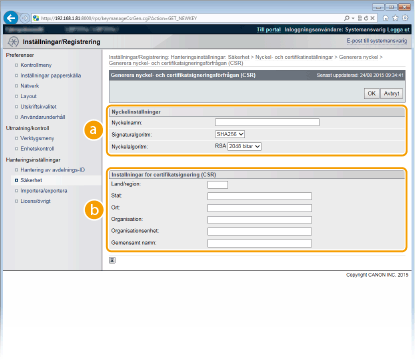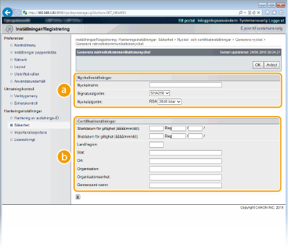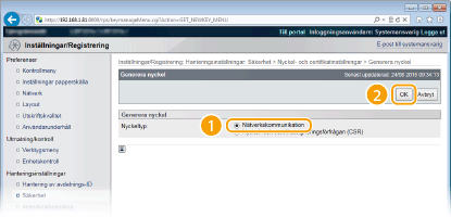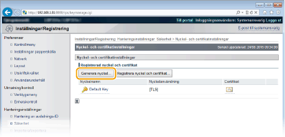 Ett nyckelpar kan genereras med enheten när det behövs för krypterad kommunikation via TLS (Transport Layer Security). Du kan använda TLS när enheten ska hanteras via gränssnittet för fjärranvändning eller vid IPP-utskrift. Upp till åtta nyckelpar, inklusive förinstallerade par, kan registreras. Självsignerade certifikat används med nyckelpar som har genererats i "Nätverkskommunikation". Med en "Nyckel och certifikatsigneringsförfrågan (CSR)" kan du ansöka om ett CA-utfärdat digitalt certifikat för nyckelparet som har genererats av enheten.