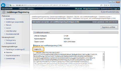 Klicka på [Bläddra] i [Filsökväg], ange filen för certifikatsigneringsförfrågan och klicka sedan på [Registrera].