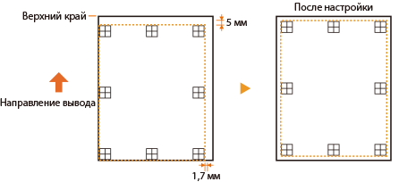 Если контрольные метки положения печати смещены относительно правильного положения, необходимо настроить положение печати. При настройке положения печати указывайте направление с помощью «+» и «–», а расстояние — с использованием «мм». Используйте «–» для смещения положения печати вверх и «+» для смещения положения печати вниз (коррекция положения по вертикали). Используйте «–» для сдвига положения печати влево и «+» для сдвига вправо (коррекция положения по горизонтали).