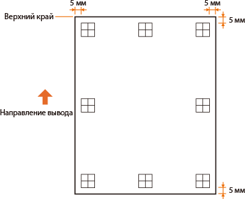 положения печати. Определите направление и расстояние настройки на основе этих меток. При нормальной настройке положения печати все метки печатаются на расстоянии 5 мм от ближайшего края бумаги.