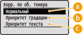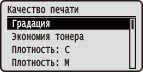 Настройки, связанных с качеством печати, включая градацию и плотность тонера, перечислены вместе с кратким описанием. Значения по умолчанию отмечены крестиком (