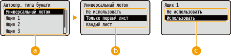 Если для параметра <Ун. лот. д/см. бум.> задано значение <Вкл.>, по возможности бумага подается из кассеты для бумаги, даже если для параметра <Приоритет унив.лотка> задано значение <Вкл.>.