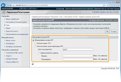![]() Если используется протокол IPPS, включите функцию шифрованной связи TLS. Использование TLS для шифрованной связи