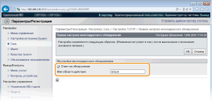 Установите этот флажок, чтобы настроить аппарат для ответа на пакеты группового обнаружения программного обеспечения управления и разрешить мониторинг с помощью программного обеспечения управления. Если настраивать аппарат для ответа, снимите этот флажок. [Имя области действия]