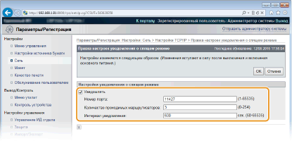 Установите этот флажок, чтобы уведомлять программное обеспечение управления о статусе питания аппарата. Если выбран параметр [Уведомлять], аппарат блокирует нежелательный обмен данными в спящем режиме, что позволяет снизить общий уровень энергопотребления. [Номер порта]