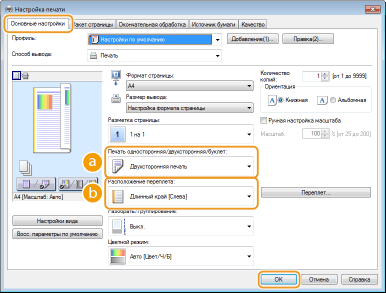 Выберите [Односторонняя печать] или [Двухсторонняя печать] в пункте [Печать односторонняя/двухсторонняя/буклет]