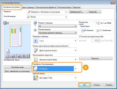 Для печати копий многостраничных документов выберите [Разобрать], чтобы напечатать полный набор страниц в последовательном порядке. Эту функцию рекомендуется использовать при подготовке проспектов для деловых встреч и презентаций.