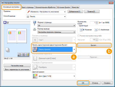 Выберите [Печать буклета] в пункте [Печать односторонняя/двухсторонняя/буклет]