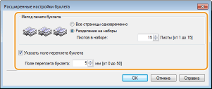 [Разделение на наборы]: печать отдельными партиями, разделенными по номерам страниц, указанным в пункте [Листов в наборе]. Скрепите каждую партию страниц и соедините их в один буклет. Используйте эту функцию в случаях, когда документ содержит слишком много страниц для печати в виде одного буклета.