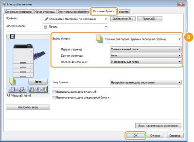 Можно печатать первую, основные и последнюю страницы на разных типах бумаги. Например, можно задать, чтобы для печати первой страницы [Первая страница] использовалась бумага, находящаяся в универсальном лотке, для печати основных страниц [Другие страницы] — бумага, находящаяся в кассете для бумаги, а для печати последней страницы [Последняя страница] — бумага, находящаяся в универсальном лотке. Можно также печатать, указав тип бумаги в параметре [Типу бумаги].