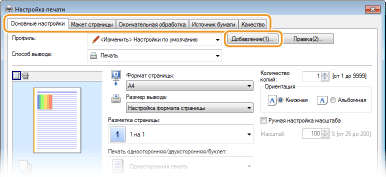 Щелкните вкладку [Основные настройки], [Макет страницы], [Окончательная обработка], [Источник бумаги] или [Качество] и укажите необходимые параметры печати на каждой вкладке.