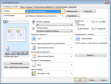 Необходимость каждый раз указывать параметры печати, например, «1-сторонняя печать на бумаге формата A4 в альбомной ориентации», отнимает время. Если зарегистрировать часто используемые комбинации параметров в качестве «профилей», то для настройки печати необходимо будет выбрать только профиль из списка. В этом разделе описана процедура регистрации профилей и их использование.