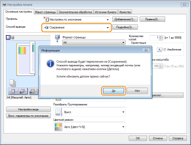 Выберите вариант [Сохранение] в пункте [Способ вывода] и нажмите [Да].