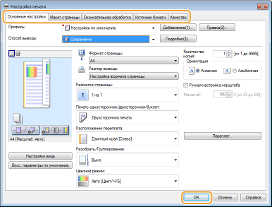 Щелкните вкладку [Основные настройки], [Макет страницы], [Окончательная обработка], [Источник бумаги] или [Качество] и укажите необходимые параметры печати на каждой вкладке.
