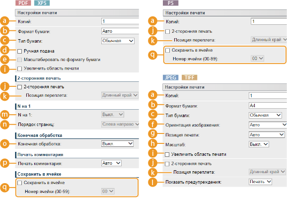 При задании настроек печати для XPS-файловСнимите флажок [Приоритет паспорта печати]. Если этот флажок установлен, некоторые пункты недоступны.