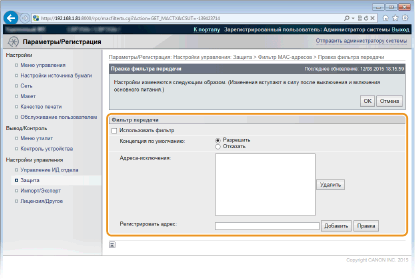 При неправильном вводе MAC-адресов доступ к аппарату из Удаленного ИП может быть невозможен. В этом случае необходимо указать для <Фильтр адресов> значение <Выкл.>. Фильтр адресов
