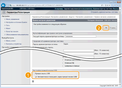 Можно отключить функцию печати данных с запоминающего устройства USB. В результате будет невозможно печатать данные, хранящиеся на запоминающем устройстве USB.