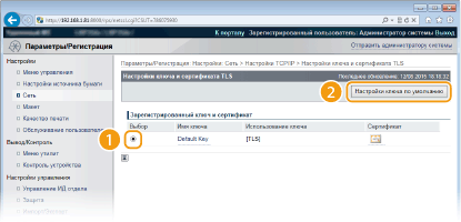 Если протокол TLS уже включен в разделе [Настройки удаленного ИП] или [Настройки печати IPP], пункт [Настройки ключа по умолчанию] не отображается. Чтобы изменить используемый ключ, см. шаг 6 и снимите флажки [Использовать TLS] в разделах [Настройки удаленного ИП] или [Настройки печати IPP], соответственно.