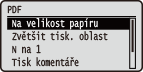 Všechna nastavení týkající se souborů PDF dostupných pro přímý tisk z USB a přímý tisk jsou uvedena s krátkým popisem. Výchozí nastavení jsou označena křížkem (