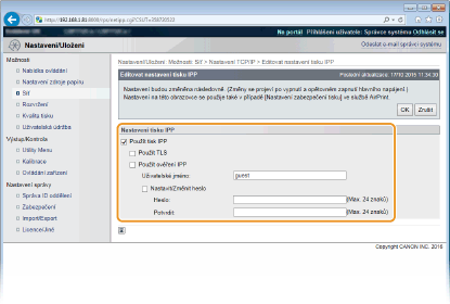 [Použít ověření IPP] Když používáte funkci ověření uživatele pro tisk IPP, zaškrtněte pole a nastavte uživatelské jméno a heslo. Když ho nepoužíváte, zaškrtnutí zrušte.