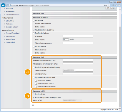 Políčko zaškrtněte, pokud chcete dynamicky aktualizovat záznamy služby DNS po každé změně IP adresy zařízení. Pro zadání typů adres, které chcete zaregistrovat na serveru DNS, zaškrtněte políčko [Uložit ruční adresu], [Uložit stavovou adresu] nebo [Uložit bezstavovou adresu]. [Nastavení mDNS]/[Nastavení volby DHCP][Použít mDNS]
