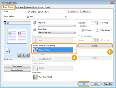 Vyberte možnost [Booklet Printing] v nabídce [1-sided/2-sided/Booklet Printing]