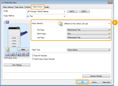 Pro první stránku, stránky s vlastním obsahem a poslední stránku můžete použít odlišný papír. Můžete například zadat papír ve víceúčelové přihrádce pro možnost [First Page] (První strana), papír v zásuvce na papír pro možnost [Other Pages] (Ostatní strany) (stránky s vlastním obsahem) a papír ve víceúčelové přihrádce pro možnost [Last Page] (Poslední strana). Tisknout lze také výběrem typu papíru v možnosti [Paper Type] (typu papíru).