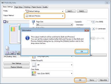 Vyberte možnost [Edit and Preview] (Úprava a náhled) v nabídce [Output Method] (Způsob výstupu).