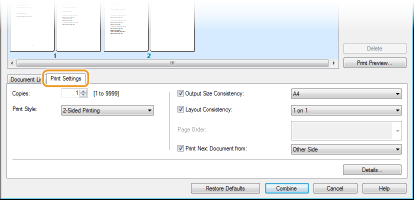Po kliknutí na možnost [Print Settings] (Nastavení tisku) se zobrazí obrazovka, na níž lze zadat nastavení tisku, například počet kopií nebo jednostranný či oboustranný tisk. Zde zadaná nastavení se použijí u celé tiskové úlohy.