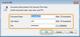 Zadejte možnost [Document Name] (Název dokumentu), [User Name] (Uživatelské jméno) a [PIN] a klikněte na [OK].