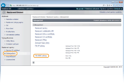 Pokud zadáte MAC adresy nesprávně, nebude možné se k zařízení připojit prostřednictvím Vzdáleného uživatelského rozhraní. V takovém případě je třeba nastavit <Filtr adresy> na možnost <Vyp>. Filtr adresy