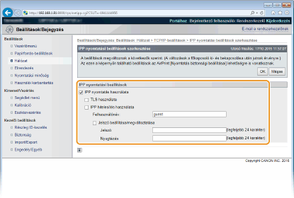 ![]() IPPS használata esetén engedélyezze a TLS protokollal titkosított kommunikáció funkciót. TLS használata a kommunikáció titkosításához