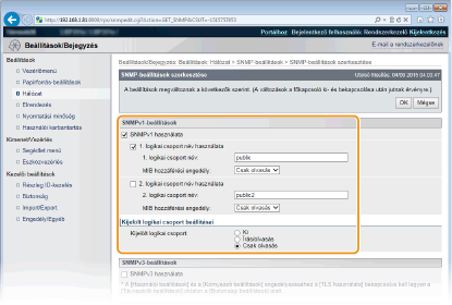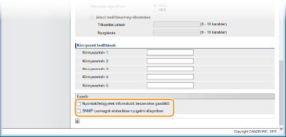 A jelölőnégyzet bejelölése esetén előfordulhat, hogy az SNMP protokollt használó alkalmazások (például a Canon imageWARE szoftversorozata) készülékhez való hozzáférését letiltja a rendszer.