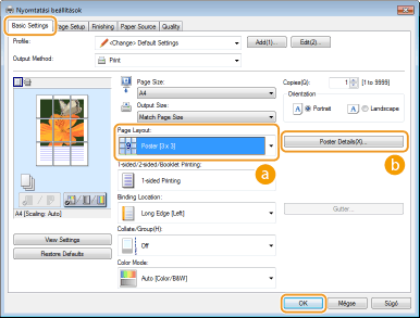 Ha a kétoldalas nyomtatás engedélyezve van, nem lehet poszterméretet választani. Válassza az [1-sided Printing] (Egyoldalas nyomtatás) lehetőséget az [1-sided/2-sided/Booklet Printing] (Egyoldalas/kétoldalas/könyvnyomtatás) beállításban, majd válasszon egy poszterméretet.