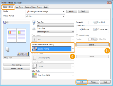Válassza a [Booklet Printing] (Könyvnyomtatás) lehetőséget a [1-sided/2-sided/Booklet Printing] (Egyoldalas/kétoldalas/könyvnyomtatás) beállításban